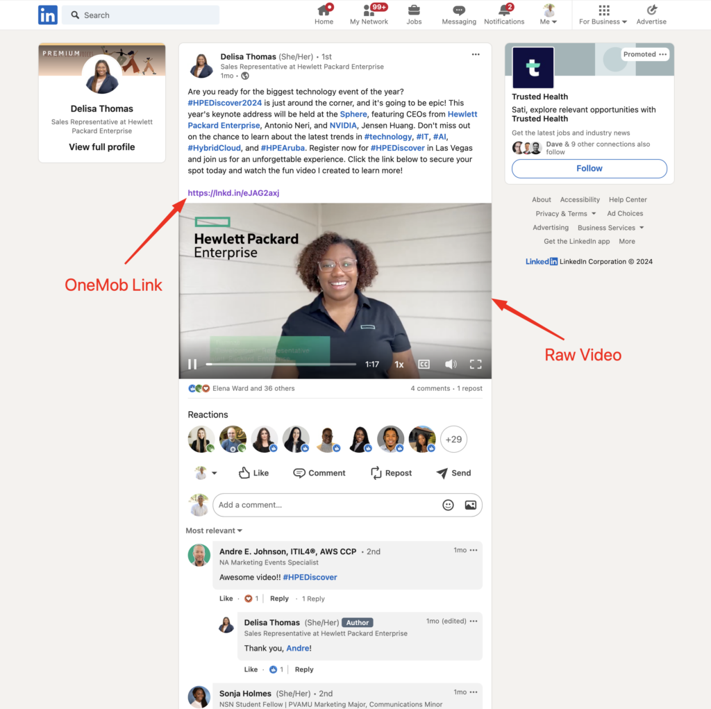 Consider a hybrid approach where you upload a short teaser or highlight of the video natively on LinkedIn and include a call-to-action with the OneMob link for viewers who want to see the full video or get more details. This strategy leverages LinkedIn’s prioritization of native content while also directing engaged viewers to a more detailed and interactive experience on OneMob. Here’s a great example.